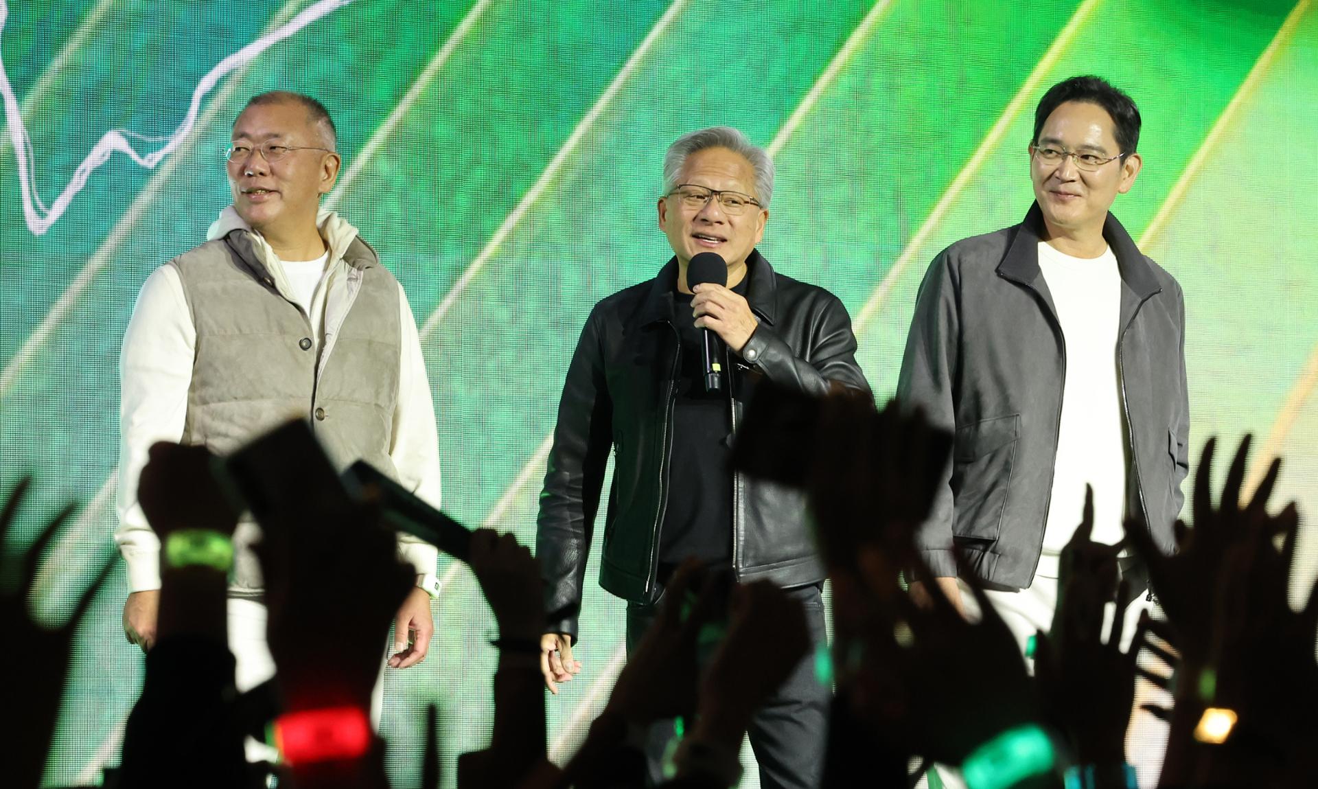 NVIDIA CEO Jensen Huang (center) speaks at the company's GeForce Gamer Festival held in Seoul on October 30th. From left: Hyundai Motor Group Chairman Jeong Eui-sun, Hwang, and Samsung Electronics Chairman Lee Jae-yong. United