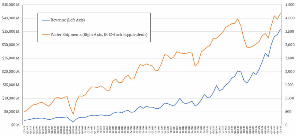 And the number of etched wafers the company can produce each month has finally broken out of the slump of 2023 and 2024. As a result, sales have increased and net profit growth has accelerated since Q3 2024, when the GenAI boom shifted from chemicals to nuclear power.