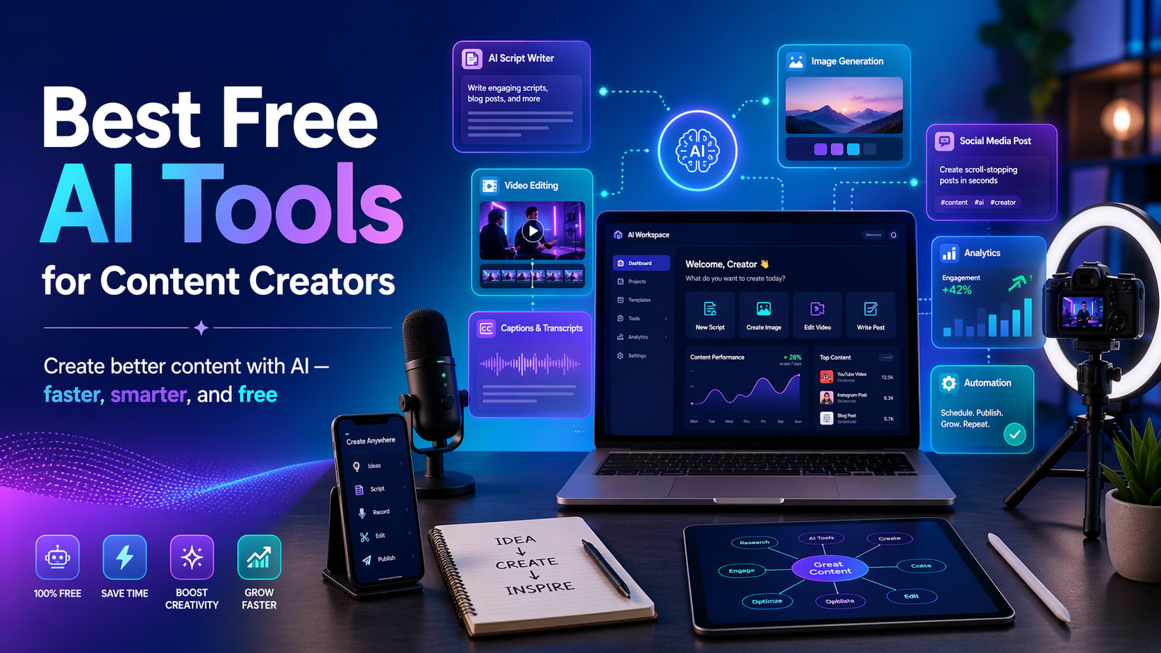 This is where AI tools can help. AI tools help content creators write scripts, generate ideas, edit videos, design thumbnails, create social media posts, improve captions, and save time.