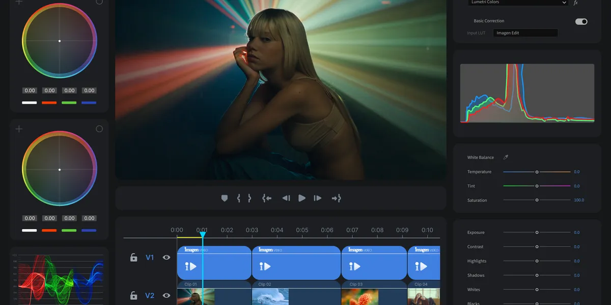 Imagen Video provides AI profiles trained with professional color styles that support custom LUTs. The platform then analyzes each clip individually, adjusting for lighting changes, white balance discrepancies, skin tones, and camera sensor differences to provide a baseline grade. This is reported to be up to “10x faster” than traditional manual methods.