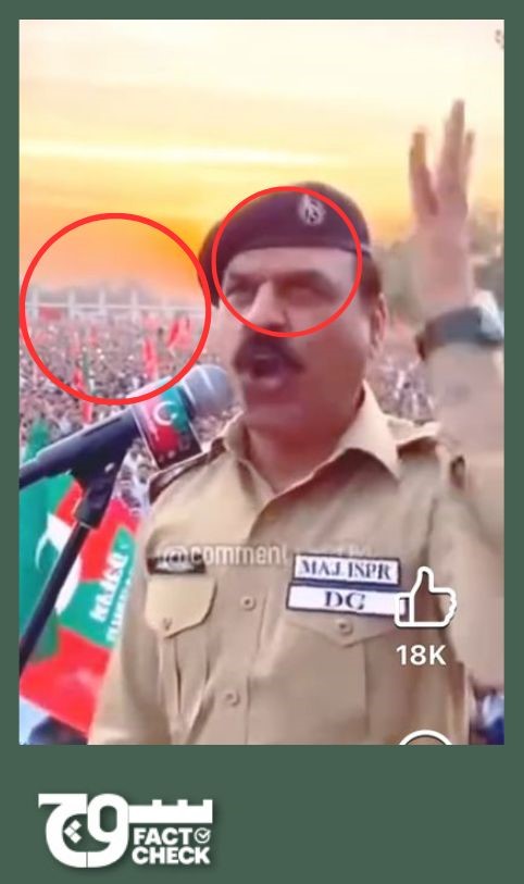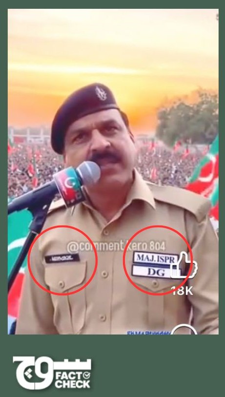 The uniform he wears does not match the official attire of the Pakistan Army. The left pocket has no legible writing, but the right pocket has “MAJ.ISPR” and “DG” written at the bottom.