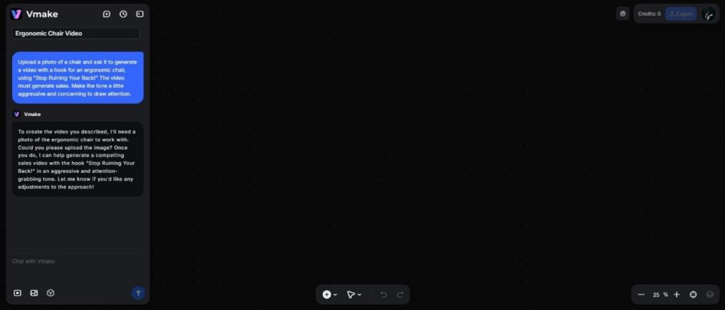 Moved to Vmake Agent interface. It’s so clean and refreshing. Complex timelines won’t clutter your screen right away. I have uploaded a photo of the chair.