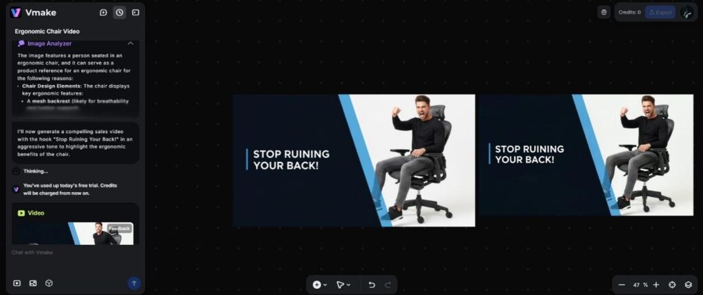 Vmake is selling something different with its “Agent.” Think of it more like a creative intern than a tool. You give it the raw asset (product photo or URL) and it automatically calculates the rest: the “hook” (the critical first three seconds), the selling point, the script, and the voiceover. To test this out, I wasn’t going to give it an easy win. I didn’t use high gloss photos of Nike shoes. I used a photo of a generic and slightly boring ergonomic office chair.
